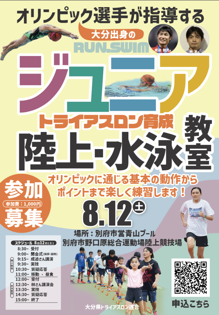 大分県の小中高校生なら誰でも参加できます。日にちは 8 月 12 日(土)、場所は別府市のプールと陸上競技場です。みんなでトライアスロンに挑戦しましょう!
