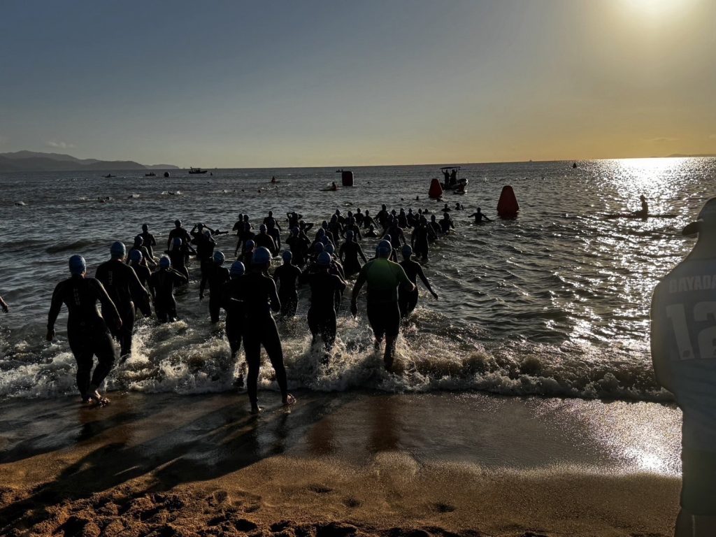 レース当日は、朝4 時に起床。5 時半にホテルを出発。6 時からトランジション準備。 カテゴリー別のウェーブスタートで、私のエイジは7 時半スタートでした。 日本のレースのような試泳の時間は設けておらず、レースの邪魔にならないように勝手に 試泳します。